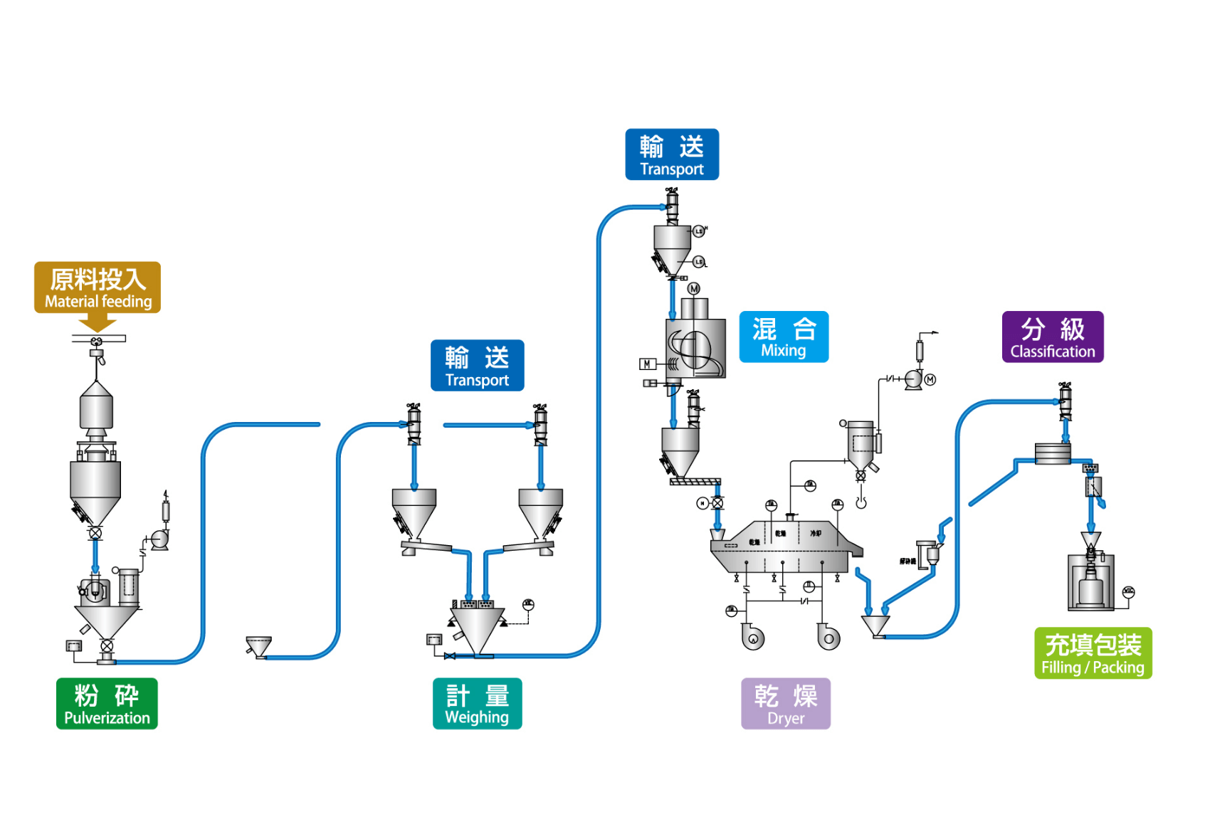 Toyo Hitec Shanghai has practical achievements in the design and construction of numerous powder processing and handling production equipment in the fields such as foods, fine chemicals, cosmetics, ceramic metals and electronic materials.