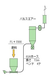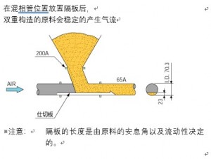 我們根據(jù)粉體特性把通過(guò)采用抽吸式空氣運(yùn)輸方式(進(jìn)入混相管)實(shí)現(xiàn)原料供應(yīng)的裝置選定為復(fù)式擋板。在這種情況下,預(yù)計(jì)可能存在因上游工段時(shí)間差導(dǎo)致原料在某一時(shí)間點(diǎn)大量供給到空輸管的情況。為了即使在這種情況下也能使空輸管不受阻礙從而實(shí)現(xiàn)穩(wěn)定的空氣輸送,我們?cè)诨煜喙芪恢米隽烁倪M(jìn)。